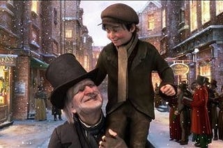 Scrooge, tranformed, carries Tiny Tim with great joy. If Scrooge can make a better world, then we may, too.
