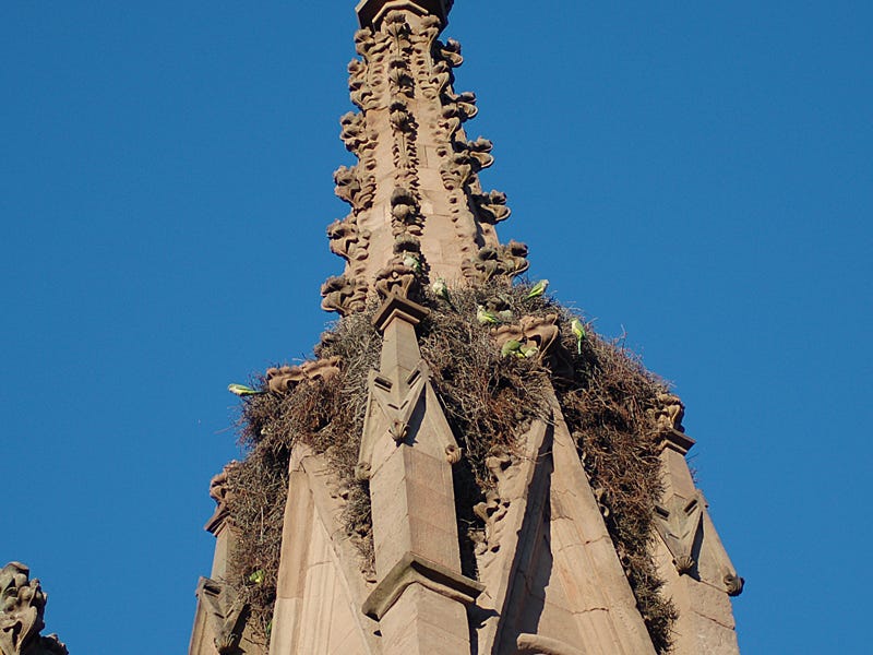 There are about 350 native birds in New York City that swell to over 500 during the migration seasons of March through October mainly because of its envious landscape, starting with the Atlantic ocean, and moving on to marsh land, ponds, rivers, reservoirs, forests, and parks. Peregrine falcons have made a very remarkable come back, drawn to the vast number of tall buildings, especially the skyscrapers surrounding Central Park, where they nest. The park is their Whole Foods market stocked with wildlife. Then there are monk parakeets: Very colorful, huge in number, incorrigible builders of long, dense nests usually crammed behind sport fields light which provides the South American natives with much needed warmth. Unfortunately, the nests occasionally catch fire. They often use the protective crevices of quiet cemetery buildings and monuments, but the structures tend to slowly crumble because of their droppings and then the birds are kicked out and have to look for other real estate.
