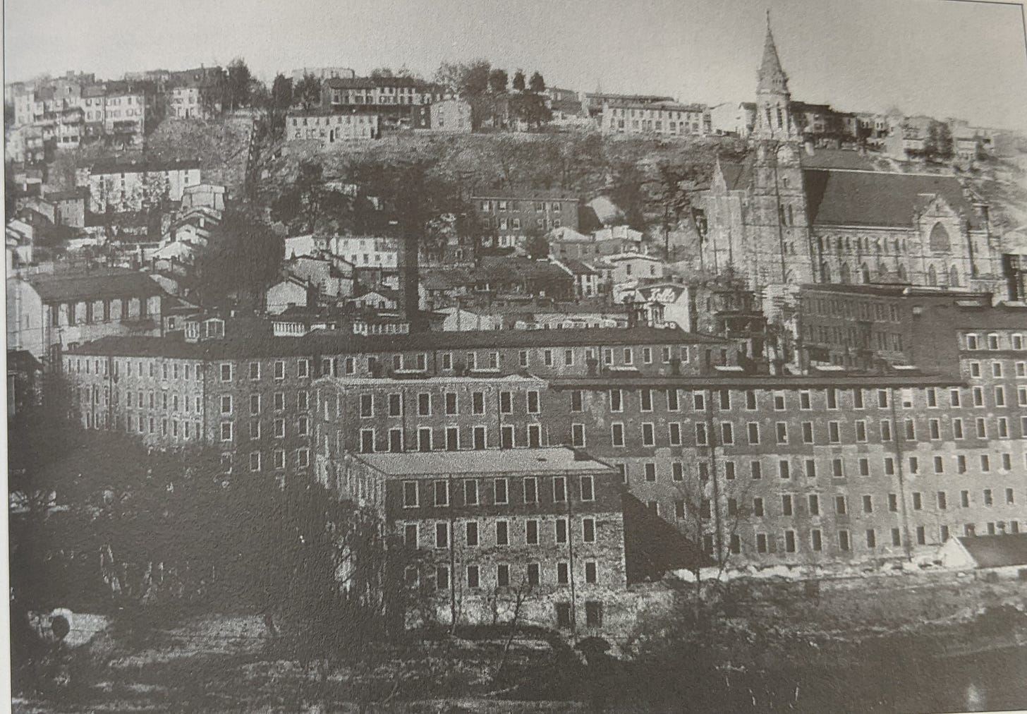 The town grew up steep hillsides, the mill workers’ small rowhouses built from the same gray mica-flecked stone they clung to. Tall Catholic church steeples soon appeared across the town as if to catch the houses from sliding down into the river. Each represented the nationalities that successively immigrated in the 19th century and who were drawn to Manayunk by the promise of the mills: Irish, Poles, Germans, and Italians. Two very old Episcopalian churches represented the English mill owners who had settled in the18th century. African-Americans freed since the Revolution carved a small wooden church in a grotto nestled precariously under a hillside ledge.
