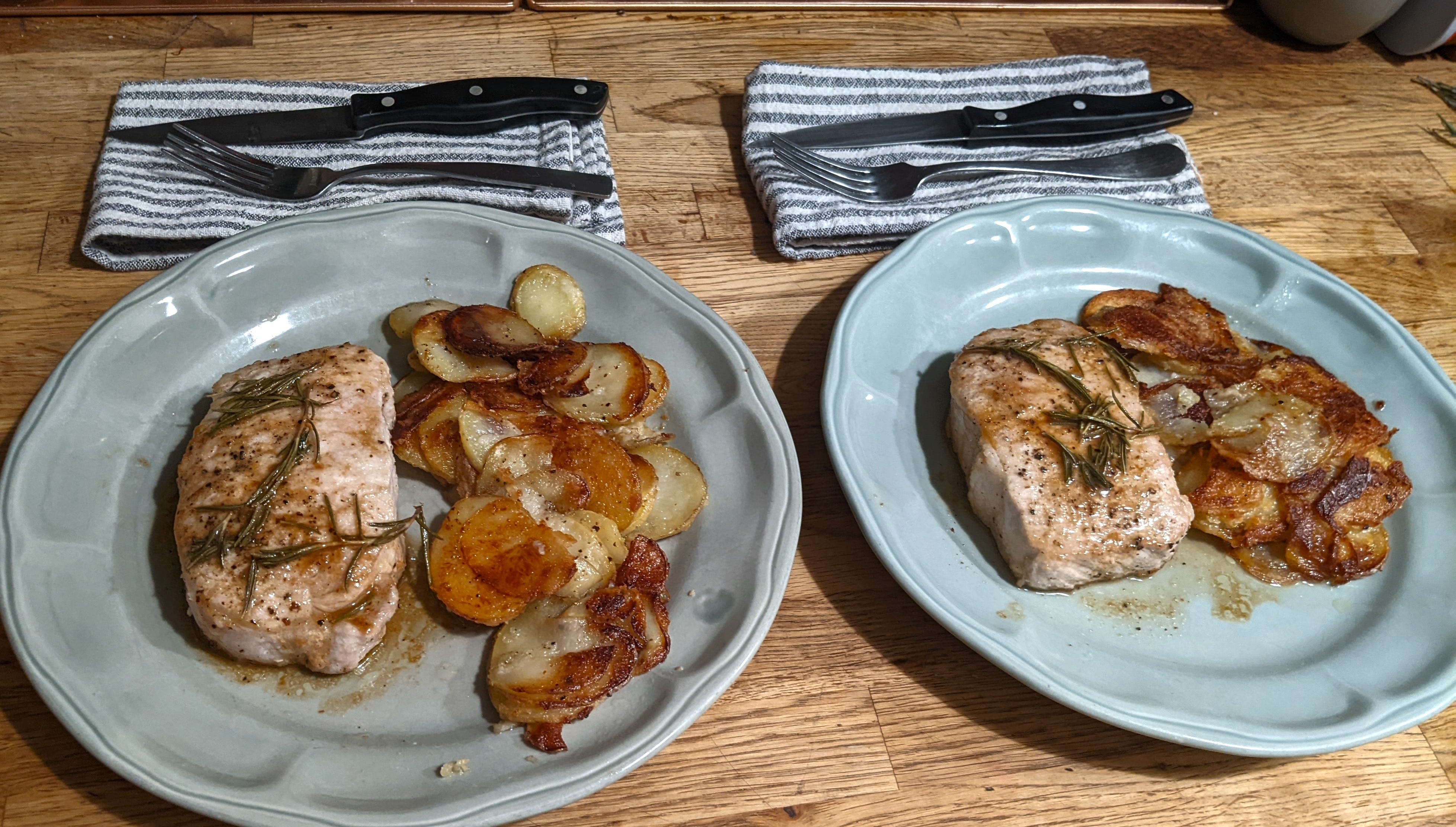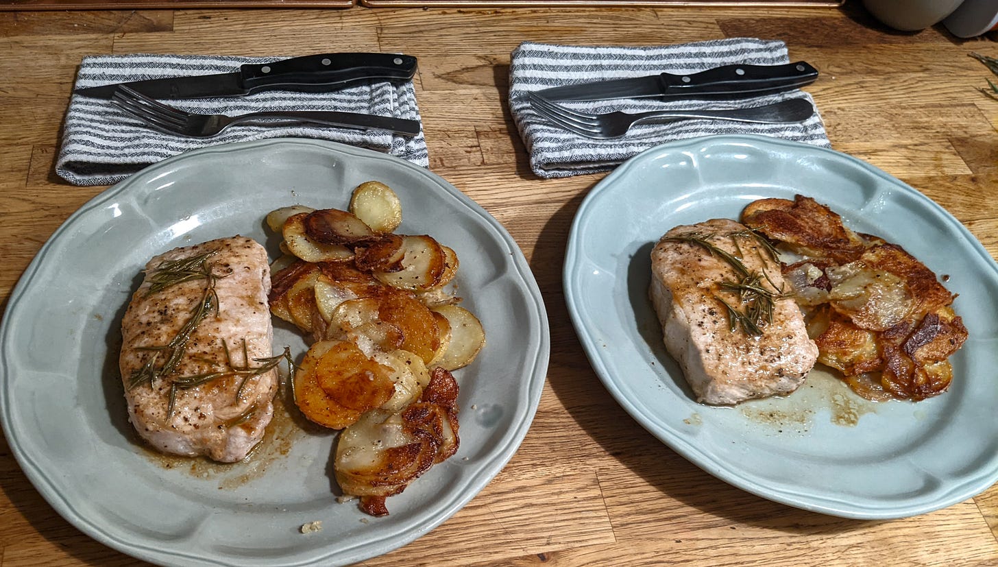And that was what I did on my part and, you know, macaroni and sausage, or pancakes for dinner aren’t so bad. For his part, he pulled out the copy of Joy of Cooking his mother gave to him when he left home and turned to the two recipes he cooked himself whenever he felt flush: sauteed pork chops and special potatoes. One Saturday, he expertly cooked them for me.
