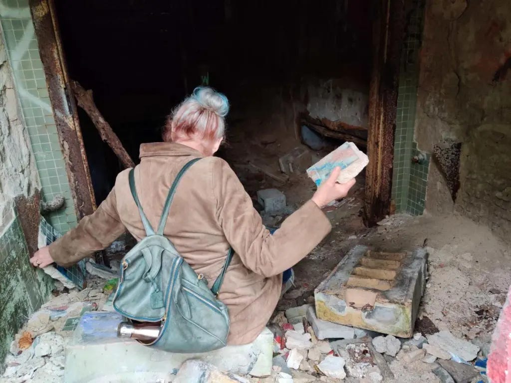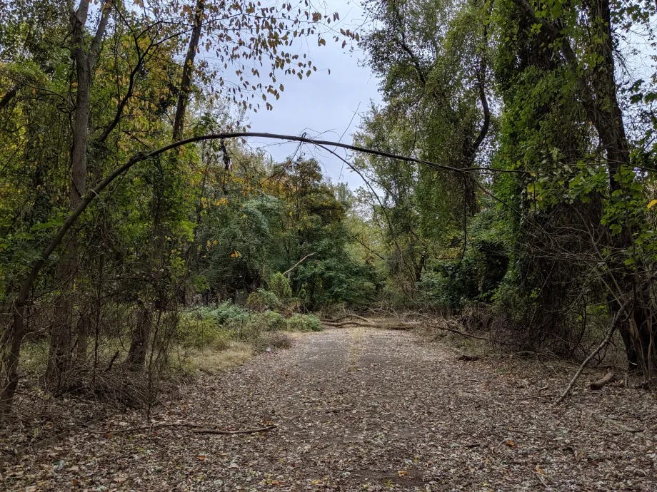 Tom directed me to a side street where there was a secluded break in the tall fencing surrounding the abandoned Colony. He hobbled out of the car toward a spot where the fence had been pulled up. A depression in the dirt underneath it marked where others had shimmy in before us. I pulled up the fence as far as I could—maybe two feet—for Tom to fit through. The boot he was wearing on his broken foot caught on the bottom links and I dropped the fence on his rump to free him. He laughed through his pain. A woman my age shouldn’t have attempted to follow him but I did. Nor should a man with a broken foot laboriously climb up a small hill overgrown with bushes and bramble. But we did. At the top we found a vestige of a road.